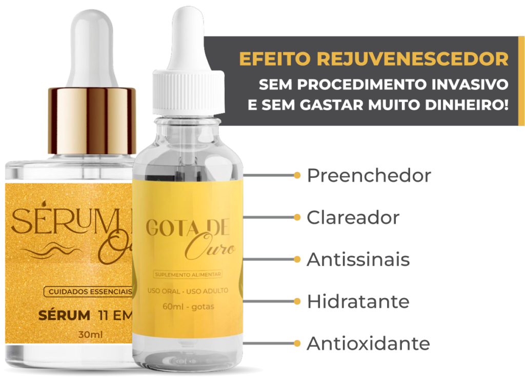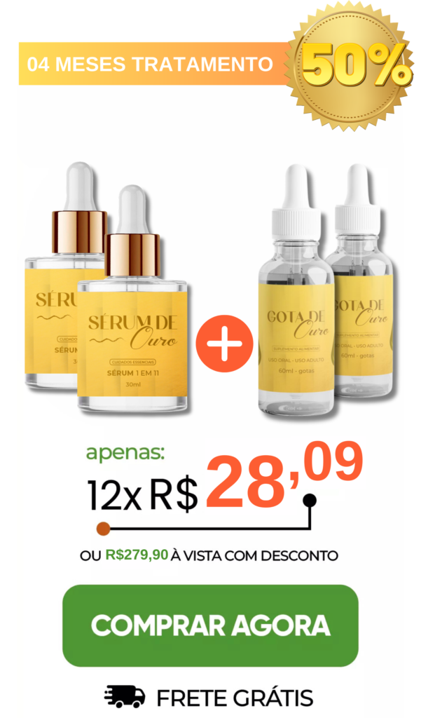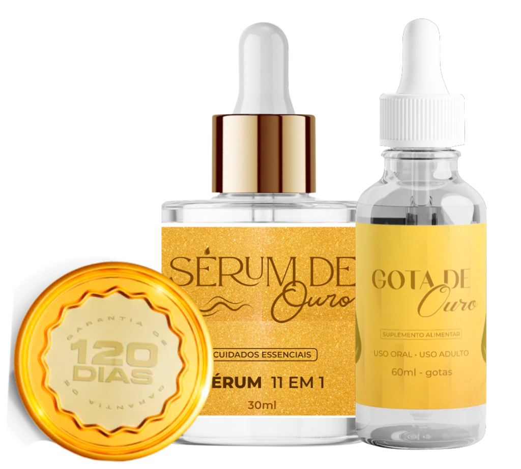 O Kit Pele de Ouro é um tratamento com formulação importada do Egito que contém um Sérum e um Frasco em Gotas, fazendo com que o tratamento traga 2x MAIS resultados na METADe do tempo! Ele age regenerando sua pele com a Tecnologia Ouro Luxor 24k, que impede os hormônios do envelhecimento e constrói novas camadas na sua pele até 13 anos mais jovem!